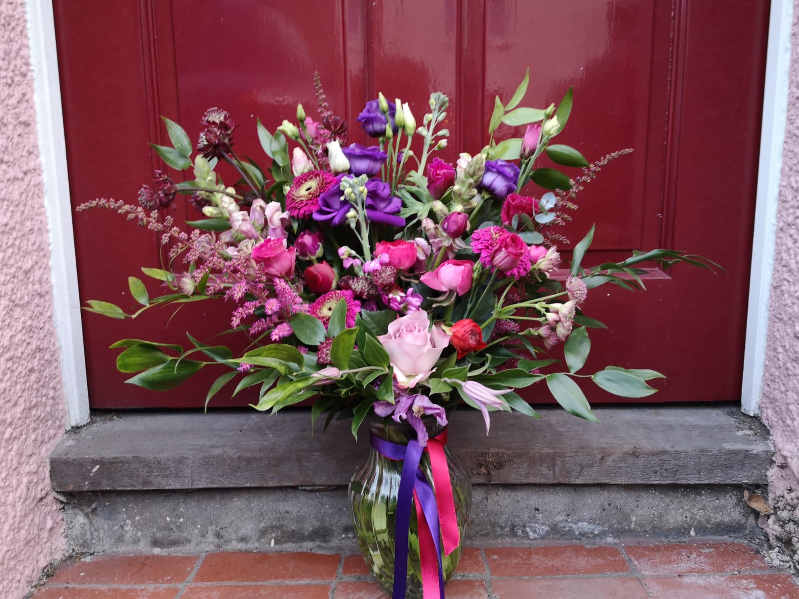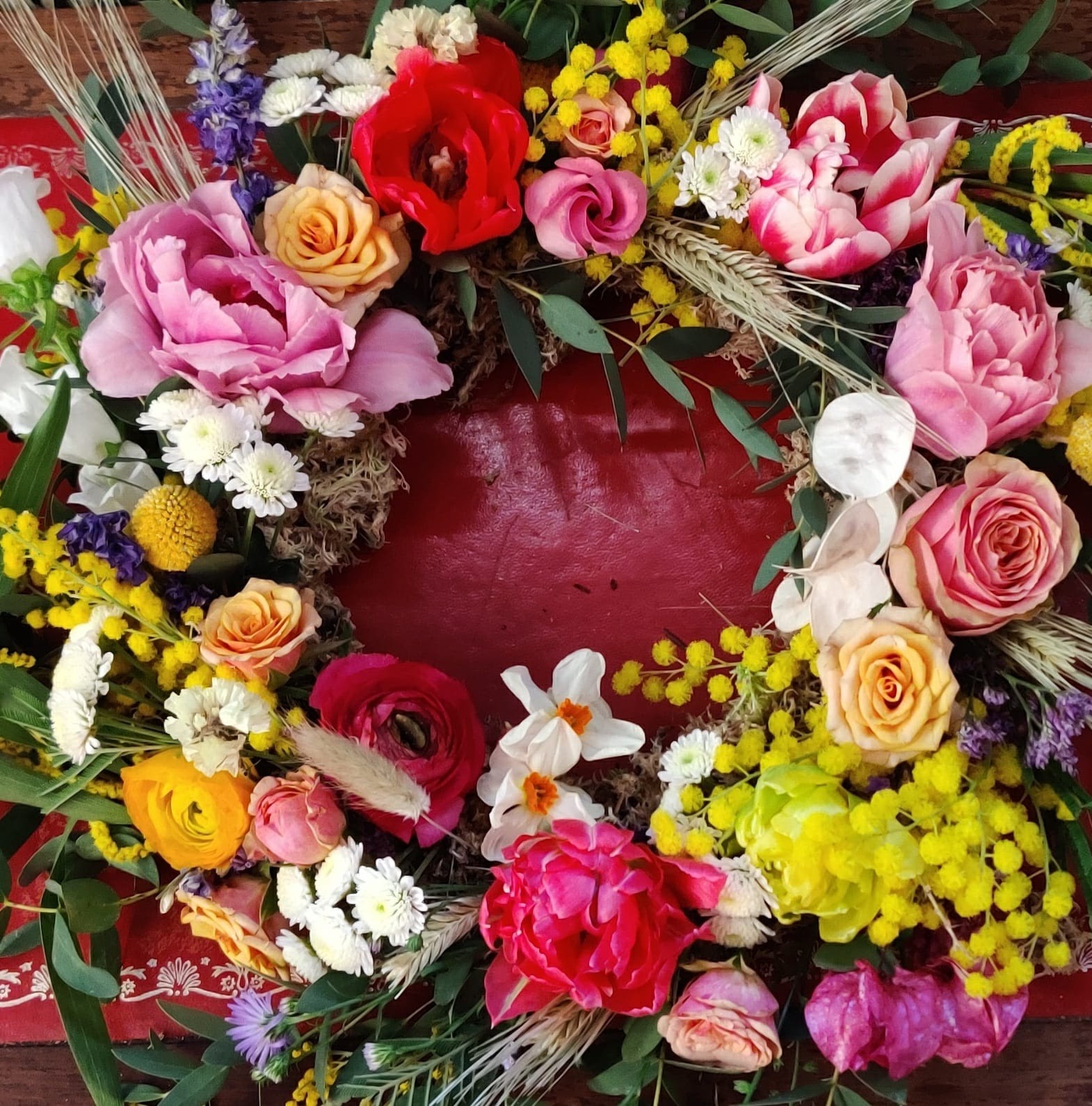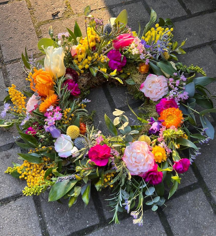 A moss based ring, made all year round using seasonal flowers. Very traditional as “Christmas Wreaths” in the Winter. Vera makes them bespoke to order for all occasions.